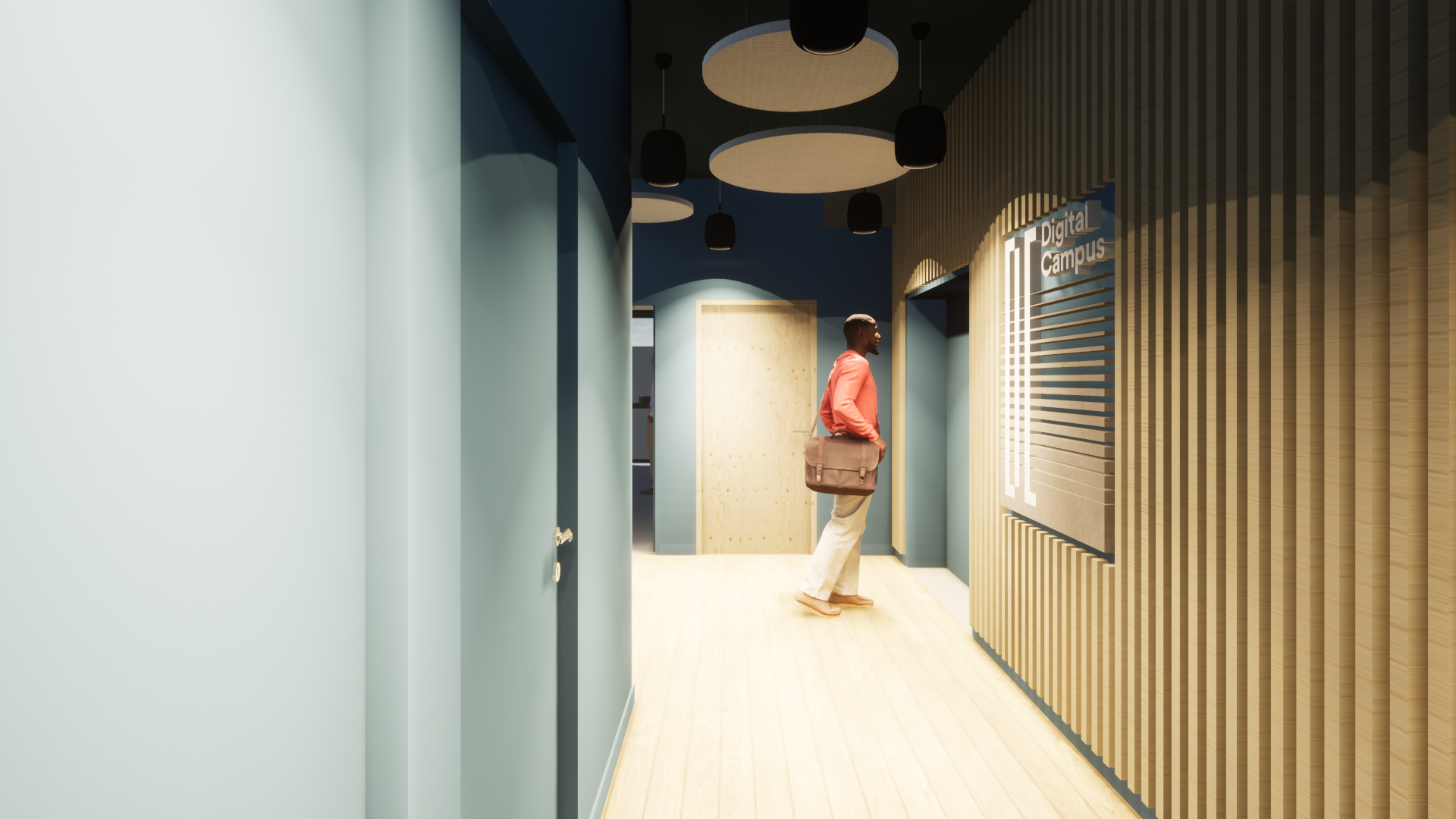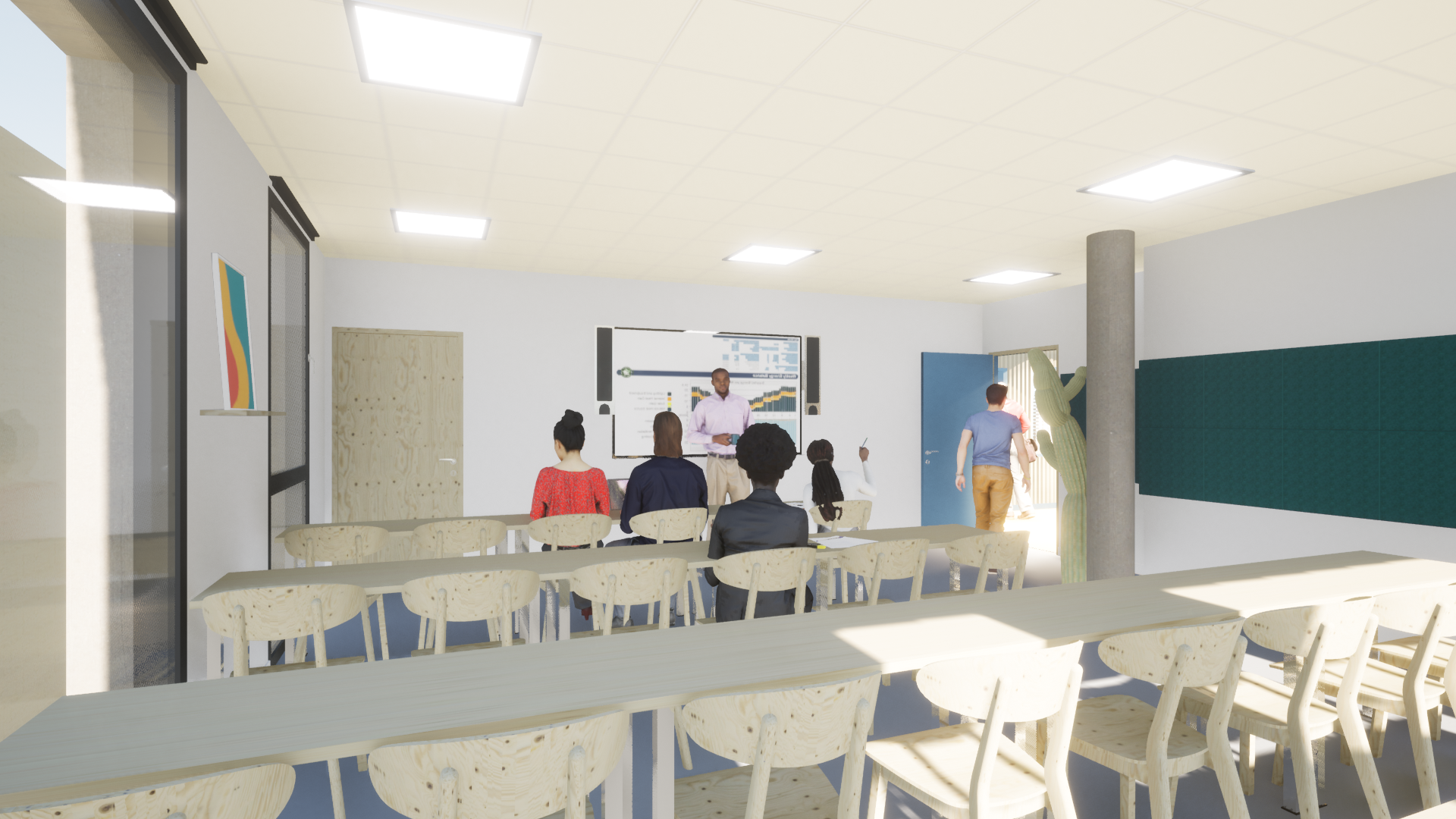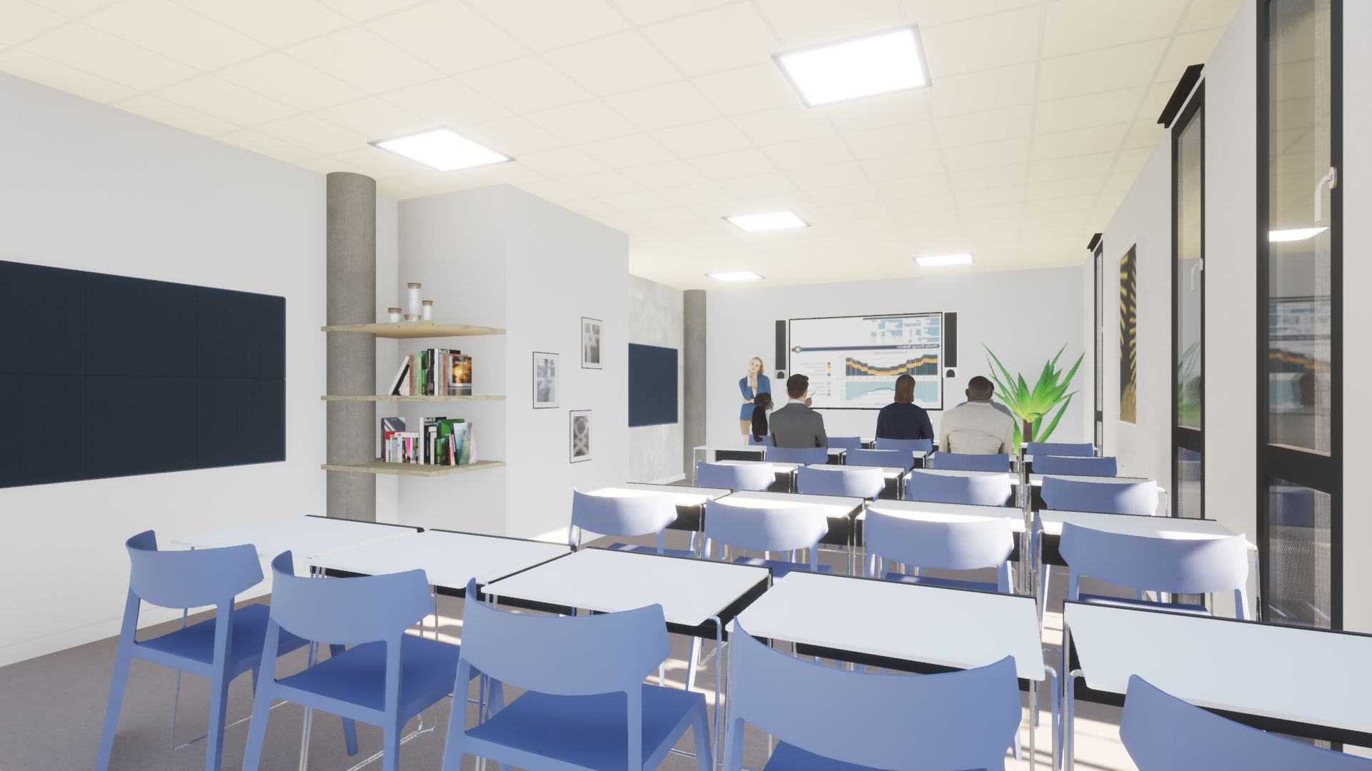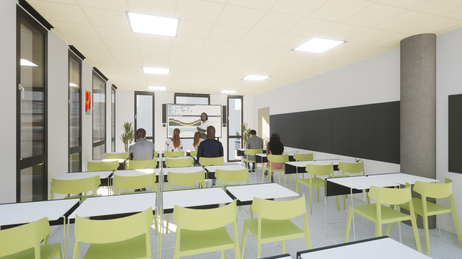 Dans cet environnement, les espaces ouverts à tous aussi bien que les espaces plus privatifs sont à prendre en compte. Des murs d’écriture, collaboratifs et laissant libre court à l’imagination peuvent venir aménager les salles de formation.