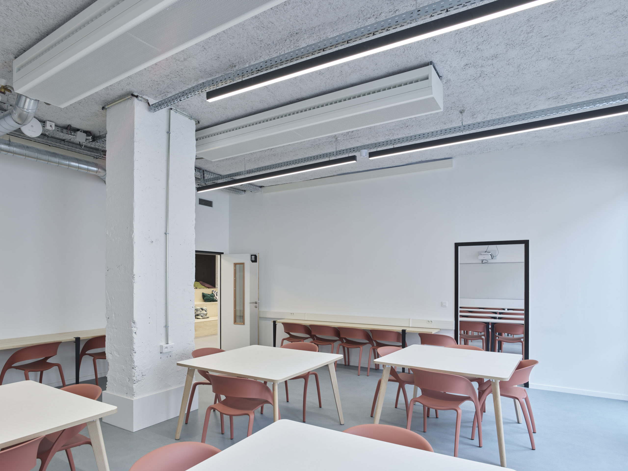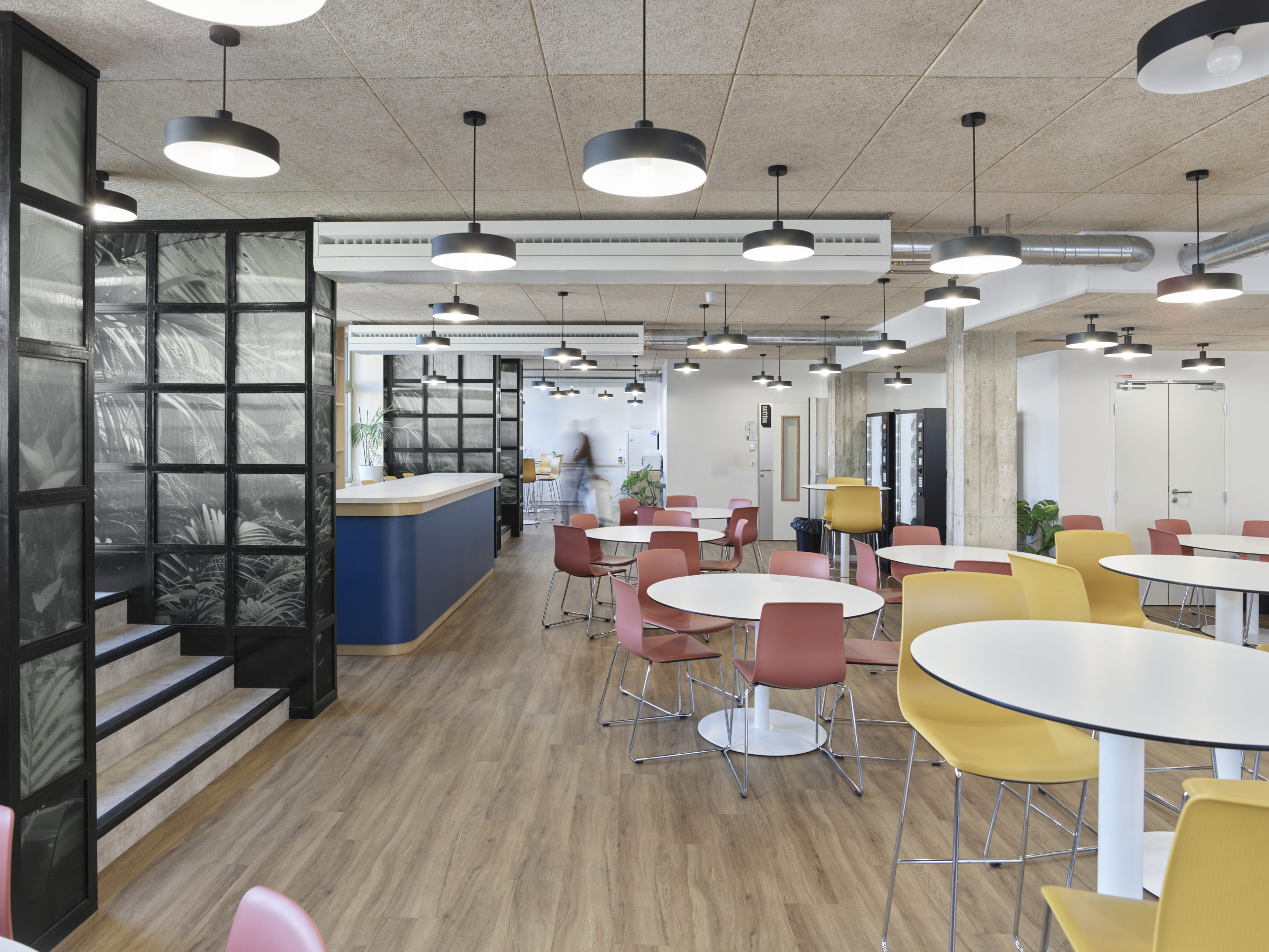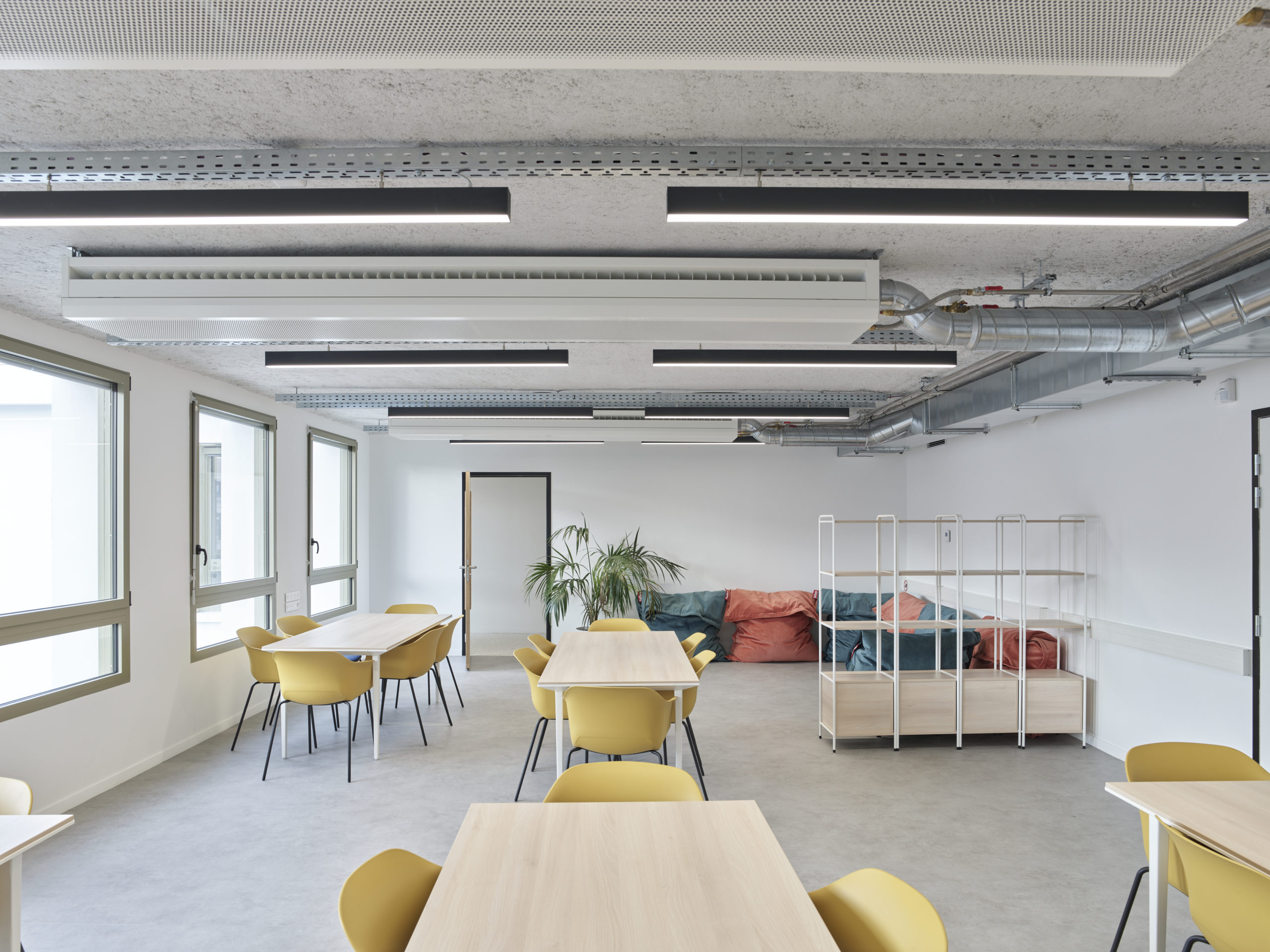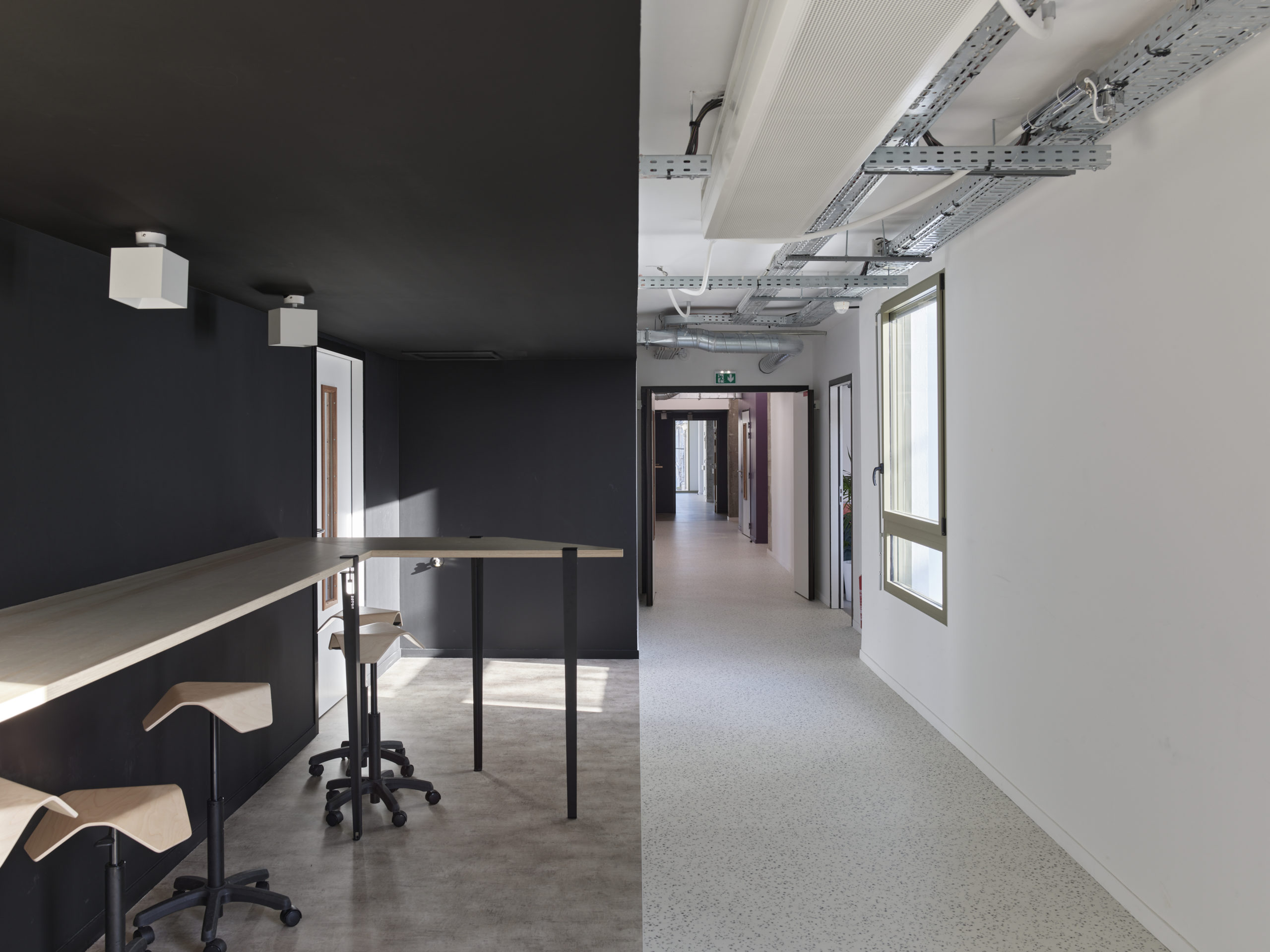 Encore une fois, les espaces de travail informels semblent être un bonne solution pour favoriser les échanges. Le design et la modernité font écho à l’image renvoyée par l’école. L’éclectisme assumé ne permet cependant pas d’enfermer dans une « bulle » l’ensemble de cet apprentissage.