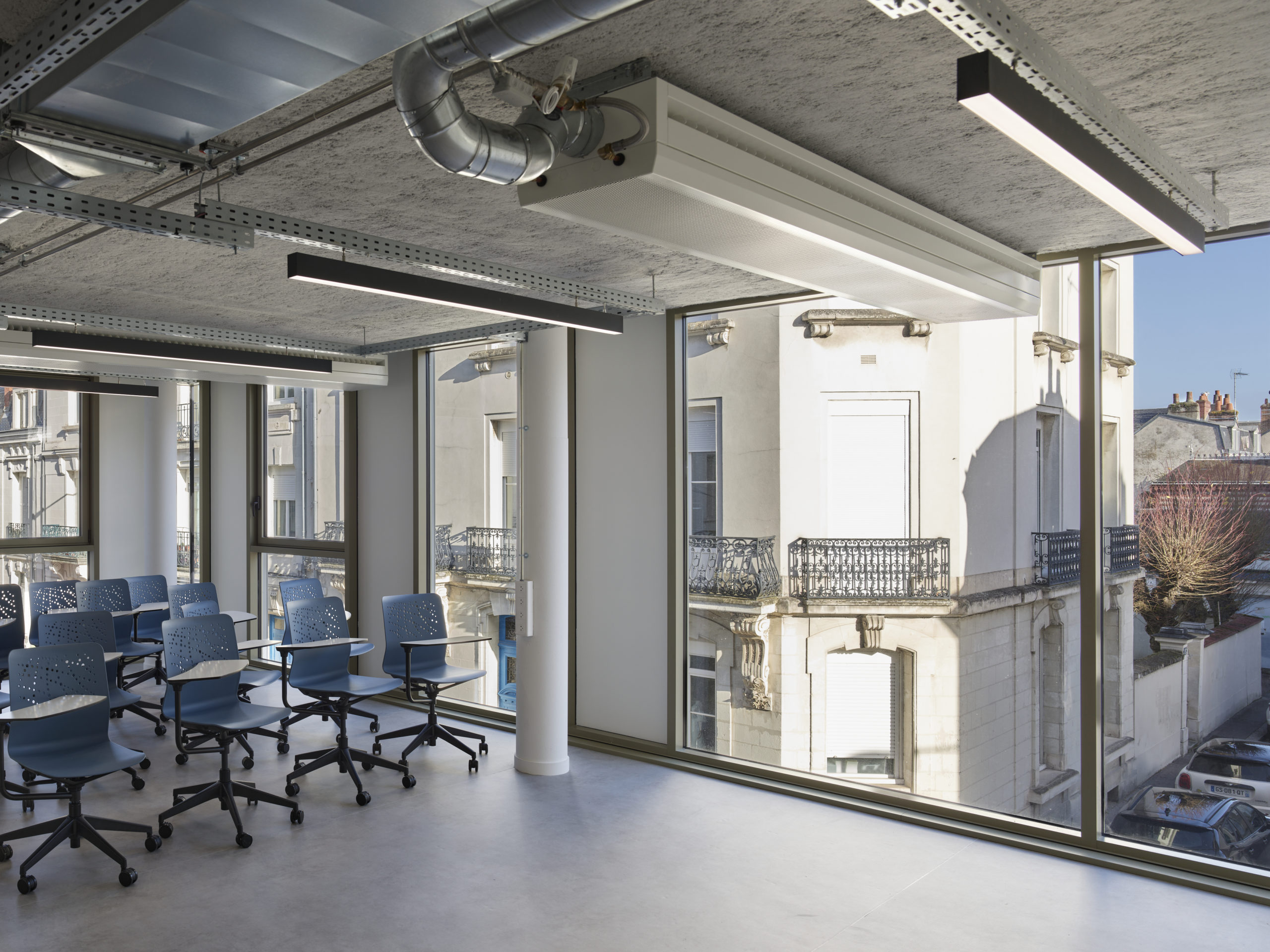Dans cet environnement, les espaces ouverts à tous aussi bien que les espaces plus privatifs sont à prendre en compte. Des murs d’écriture, collaboratifs et laissant libre court à l’imagination peuvent venir aménager les salles de formation.